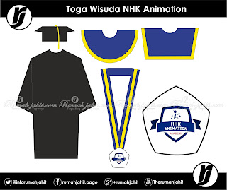 Toga Wisuda NHK Animation yang satu ini agak lumayan bagus untuk standar Toga Wisuda karena menggunakan bahan yang tidak standar. Bahan yang di gunakan Besyway warna Hitam. Atas pemikiran tersebut maka jadilah baju Toga Wisuda yang “manis” dengan bahan Bestway warna Hitam. Pada topi berbahan Bestway dengan warna Hitam kuncir Kuning. Pada kalung menggunakan bahan Saten warna Biru list Kuning model gantung plus medali menggunakan logam kuningan berlogo dilapisi resin, dan juga pada Tabung wisuda menggunakan bahan Beludru warna Biru list Kuning kuncir Kuning, logo sablon.