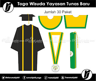 Toga Wisuda Yayasan Tunas Baru yang satu ini agak lumayan bagus untuk standar Toga Wisuda karena menggunakan bahan yang tidak standar. Bahan yang di gunakan Bestway warna Hitam kombinasi Saten warna Kuning. Atas pemikiran tersebut maka jadilah baju Toga Wisuda yang “manis” dengan bahan Bestway warna Hitam kombinasi Saten warna Kuning. Pada topi berbahan Bestway dengan warna Hitam kuncir Kuning. Pada kalung menggunakan bahan Saten warna Kuning list Hijau model gantung plus medali menggunakan logam kuningan berlogo dan terlapisi resin. Selain itu pada bagian Tabung wisuda menggunakan bahan Beludru warna Hijau list Kuning  logo emboss foil emas, tanpa isi.