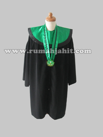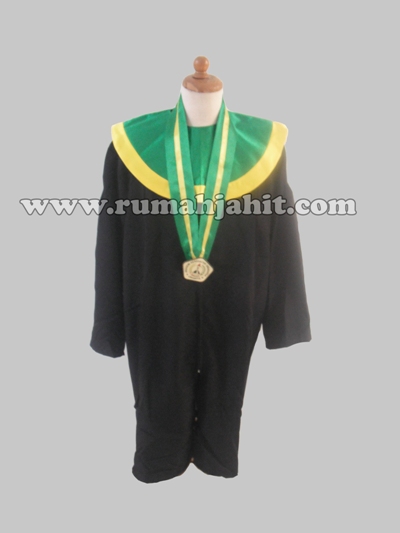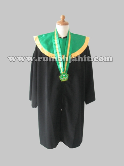 Toga Wisuda karena menggunakan bahan yang tidak standar. Bahan yang di gunakan Bestway berwarna Hitam. Sleber atau kerah menggunakan bahan Satin berwarna Kuning, dengan model terpisah, resleting depan. Untuk Topi menggunakan bahan Bestway berwarna Hitam tali/kuncir Kuning. Bahan kalung menggunakan bahan Satin berwarna Biru list Kuning, dengan liontin menggunakan bahan Kuningan berlogo kampus dilapisi resin. Dan Map Ijazah menggunakan bahan Kalep berwarna Biru, belogo kampus dengan tulisan warna Kuning Emas.